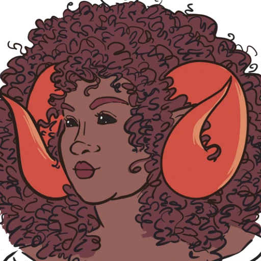 Appearance Short, fat, dark-skinned tiefling woman in her late twenties, with curly dark hair, black eyes, and ram horns.