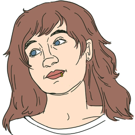 A chubby white person in their 20s with pale skin, blue eyes and long brown hair.